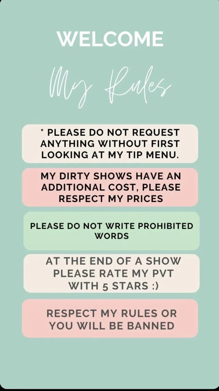 도기 스타일, 아헤가오, 야외, 미스트레스(여주인), 스팽킹, 에로틱 댄스, 카멜토우, 자지 평점, 스트랩온, 라텍스, 마사지, 트월킹, 상의탈의, 하이힐, 분수, 오일 쇼, 하드코어, 풋잡, 핸드잡, 젖치기, 자위, 보지 핥기, 니플 기구, 롤플레이, 스모킹, 굴욕, 페이셜, 샤워, 음란한 대화, 핑거링, 가죽, 스트립쇼, 블로우잡